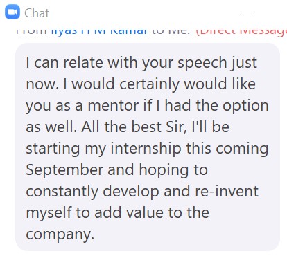 While there were many questions posed which was as part of the moderation, the main task of a speaker is to attract, influence and inspire the audience. While the moderations, there were many responses, and1 response which caught my attention was as attached above.